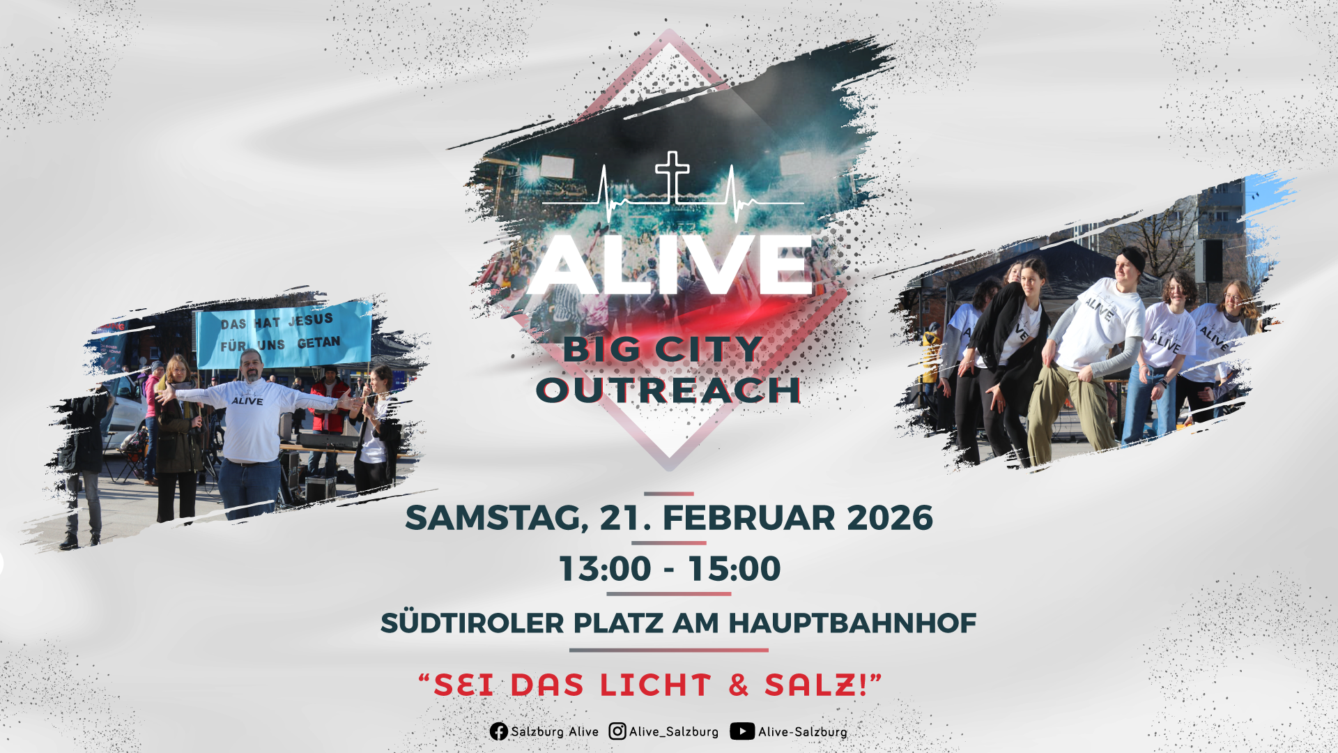 ALIVE-Outreach Am Samstag, den 19. September von 13:00-15:00 Uhr findet am Kapitelplatz Salzburg (in der Altstadt) ein Alive-Outreach statt, bei dem Gläubige aus verschiedenen Gemeinden auf die Straße gehen, um die Frohe Botschaft des Evangeliums zu den Menschen zu bringen.